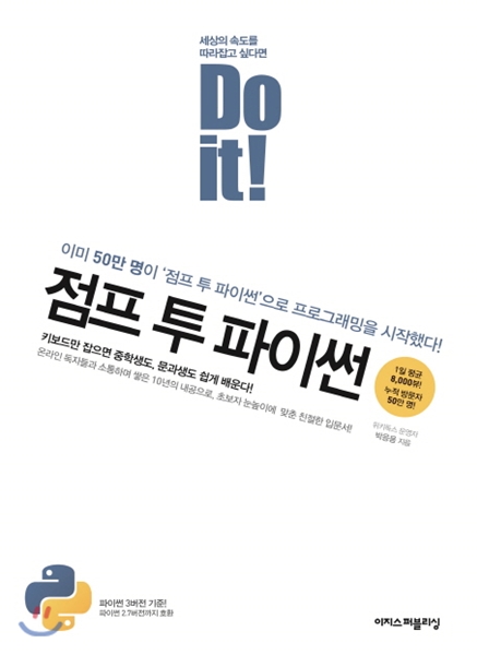 검색해보니 과거에 R을 혼자 공부할 때 봤던 ‘Do, it!’ 시리즈에 파이썬도 있어서, ‘Do, it! 점프 투 타이썬’ 책을 보면서 혼자서 파이썬을 공부해보려고 합니다.